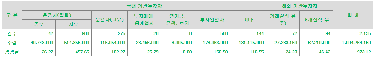 한편, 수요예측에 참가한 기관투자자 중 수요예측 결과 배정받은 물량을 초과하여 청약하고자 하는 기관투자자는 전체 기관투자자 배정물량 범위 내에서 추가 청약이 가능합니다. 또한 수요예측에 참가하지 않았거나, 수요예측에 참여하였으나 배정받지 못한 경우에도 확정공모가액으로 배정을 받기를 희망하는 기관투자자 등은 대표주관회사에 미리 청약의사를 표시하고 청약일에 추가 청약할 수 있습니다. 다만, 수요예측에서 배정된 수량이 모두 청약된 경우에는 배정받을 수 없습니다. 또한, 청약일 종료 후 미청약된 물량에 대해서 배정 전까지 기관투자자는 추가로 청약을 할 수 있으며, 추가 청약된 물량의 배정은 대표주관회사가 자율적으로 결정하여 배정합니다.