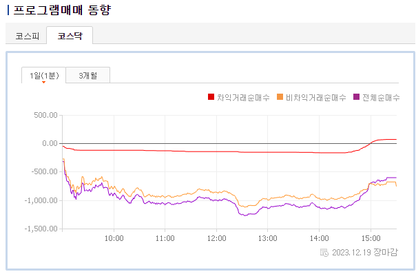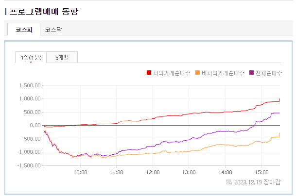 프로그램 매매동향은 오늘은 차익은 순매수로 마감하고 비차익은 순매도로 마감하였습니다