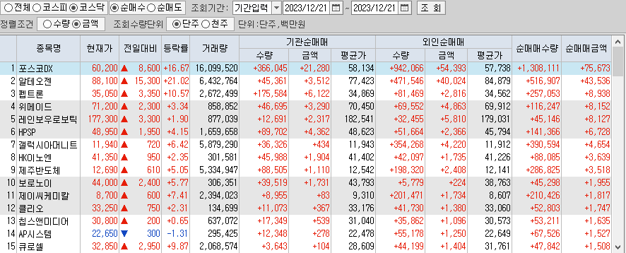 코스닥 시장 외국인+기관 순매수/매도 종목