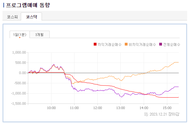 프로그램 매매 동향은 차익은 순매도로 마감하였고 비차익은 순매수로 마감하였습니다