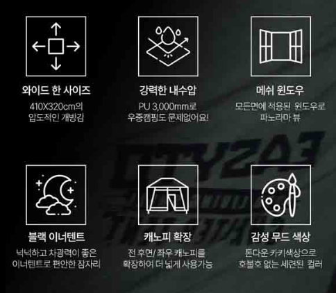 - 기본적인 방수 기능을 갖추고 있으며, 스커트(바람막이)가 장착되어 동계 캠핑에도 적합.