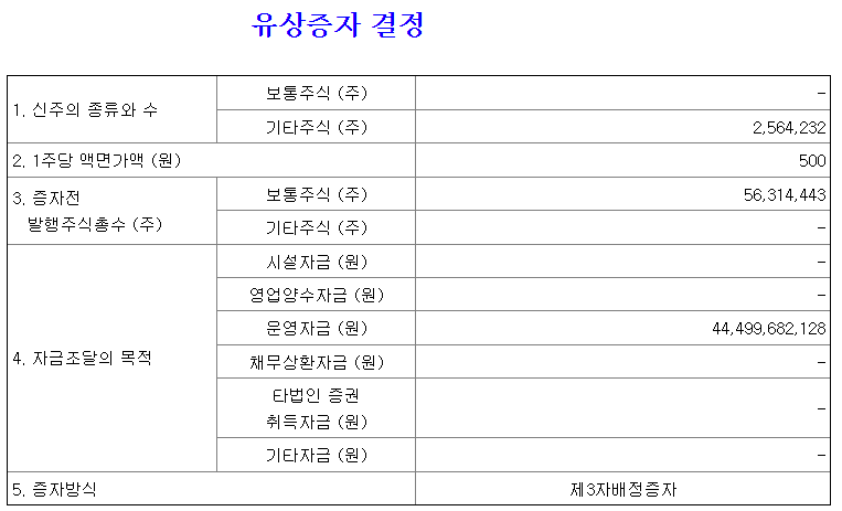② 총 444억9968만2128원의 운영자금 조달을 위한 2,564,232주의 기타주식(상환전환우선주식, RCPS) 발행 예정
