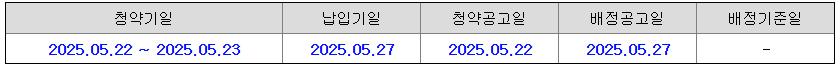 - 일반청약자 청약일: 2025년 05월 22일 (목)~ 23일 (금) (2일간)