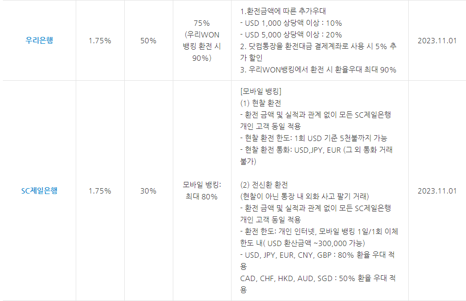 그럼 다른은행은 얼마나 환전에 대한 수수료 혜택이 있나?