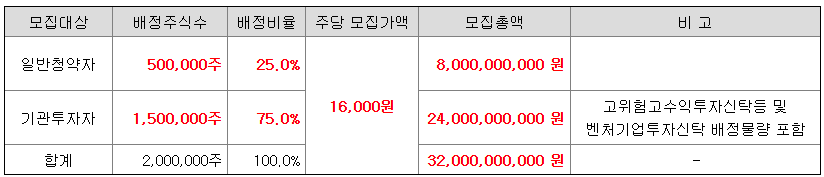 주당 모집(매출)가액 및 모집(매출)총액은 대표주관회사와 발행회사가 협의하여 결정한 확정공모가액 16,000원 기준입니다.