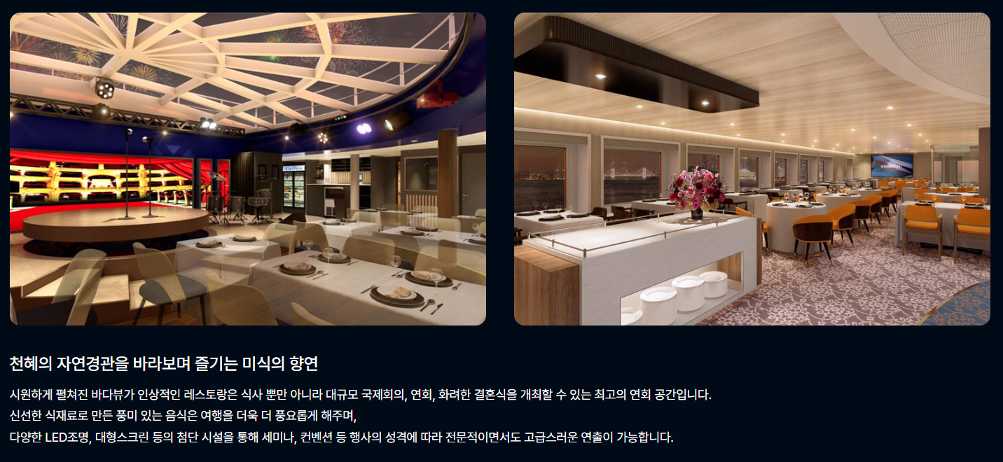 미라클호의 가장 큰 매력 중 하나는 바로 고급스러운 저녁 식사와 함께 즐길 수 있는 공연이에요. 선상 레스토랑에서는 신선한 해산물 뷔페부터 깔끔한 한식, 웨스턴 스타일의 메뉴까지 다양하게 준비되어 있어요. 먹는 즐거움은 물론, 식사 중간중간 펼쳐지는 라이브 공연이 분위기를 한층 더 끌어올려줍니다.