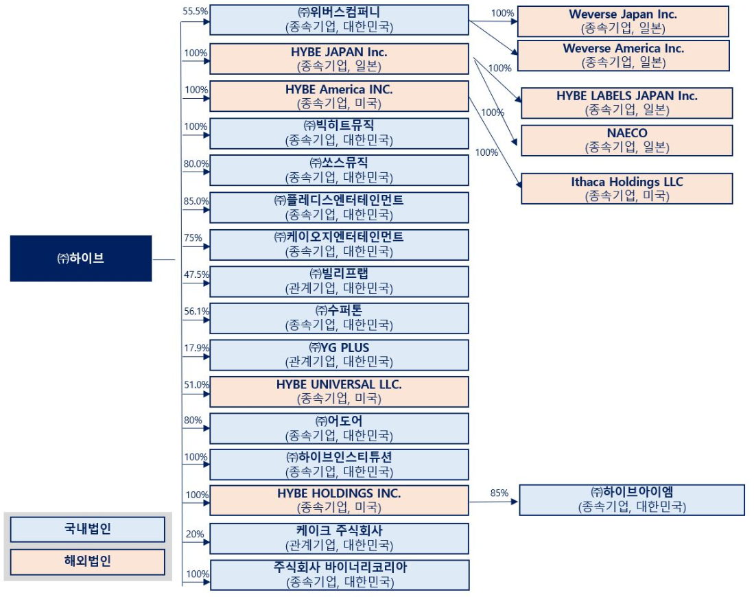 당사의 연결실체는 다양한 아티스트 및 음악 IP 창출을 담당하는 복수의 레이블을 바탕으로 콘텐츠를 활용한 사업모델을 발굴하여 시장 부가가치를 창출하는 솔루션 영역, 콘텐츠를 집결하여 팬에게 직접 전달하는 플랫폼 영역 등 음악 관련 가치사슬의 전 영역을 포괄하고 있습니다.