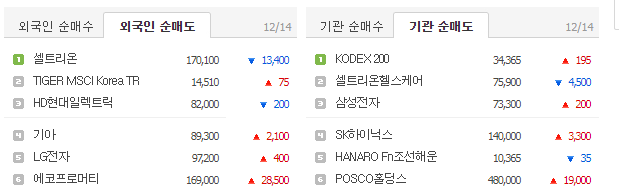 금일 매도 상위 종목에 외국인은 셀트리온을 기관은 KODEX200을 순매도 상위에 위치했습니다