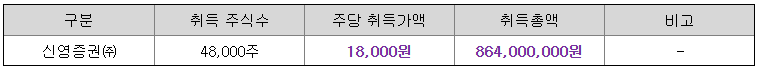 주당 취득가액 및 취득총액은 대표주관회사와 발행회사가 협의하여 결정한 확정공모가액 18,000원 기준입니다.