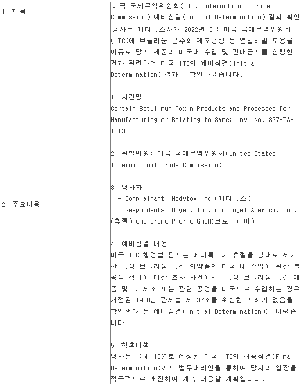 ① 미국 국제무역위원회(ITC) 예비심결 결과, 메디톡스가 제기한 휴젤에 대한 보툴리눔 톡신 제품의 불공정 행위 조사에서 위반 사례가 없음을 확인하였음