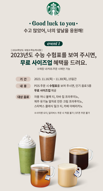 내용:POS주문시 수험표를 보여주면 인기 음료 5종 무료 사이즈업 제공