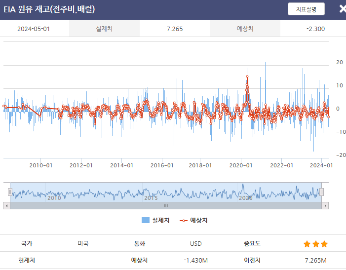 EIA 원유 재고(전주비,배럴)는 Energy Information Administration에 의해 발표되며 미국 기업들이 보유한 상업용 원유의 주간 변경량을 측정한다. 재고수준은 석유 제품의 가격에 영향을 미치며 이는 인플레이션에 영향을 미칠 수 있다. 만약 원유 재고증가가 예상보다 많다면, 이는 수요가 약하다는 것을 의미하며 원유 가격에 부정적인 영향을 미친다. 반대로 원유 재고 증가가 예상보다 적거나, 감소가 예상보다 많다면, 이는 수요가 높다는 것을 의미하며 원유 가격에 긍정적인 영향을 미친다