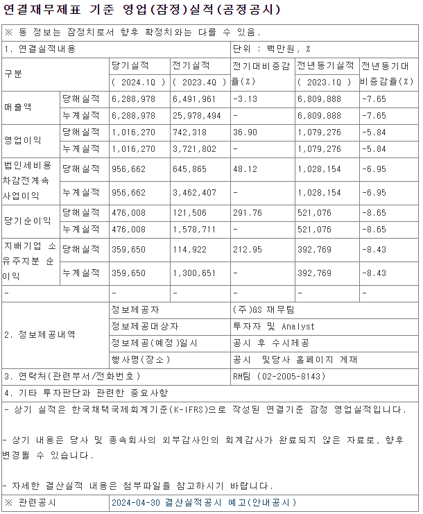 ① 연결재무제표 기준의 2024년 1분기 잠정 영업실적이 공시되었음.