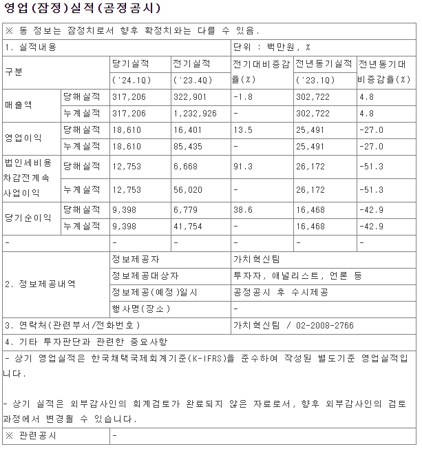 ② 2024년 1분기 매출액은 317,206백만원으로 전기(2023년 4분기) 대비 1.8% 감소, 전년 동기 대비 4.8% 증가함